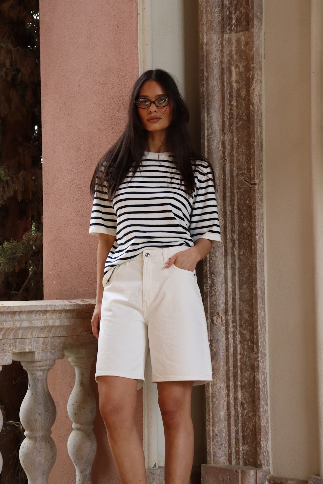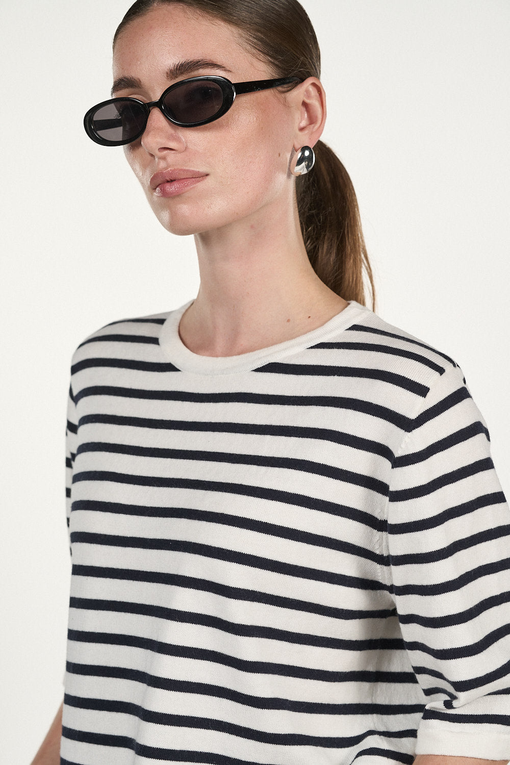 Gå sommeren i møte med vår herlige Gurli T-skjorte. Den tynne strikken med sine vakre hvite og marineblå striper består av 5 % kasjmir og 95 % bomull. Med litt lengre T-skjorter og en elegant passform er den perfekt for varme dager. Kom i sommerstemning med vår Gurli T-skjorte ved å style den med våre Galina-bukser eller et par denimshorts for et mer avslappet uttrykk.