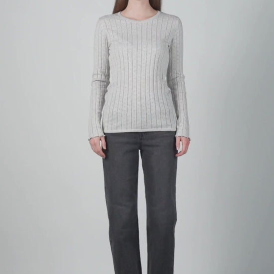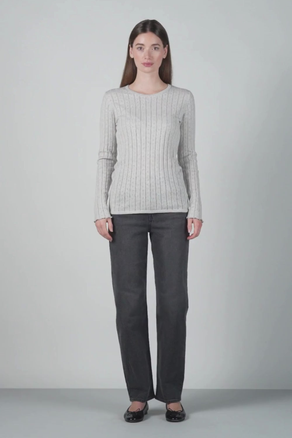 Kristin er den perfekte basisblusen som passer inn i enhver garderobe. De bølgede kantene og pointelle-detaljene gir denne essensielle blusen et enkelt, men feminint uttrykk. Blandingen av cashmere og bomull gjør den myk og behagelig å ha på.