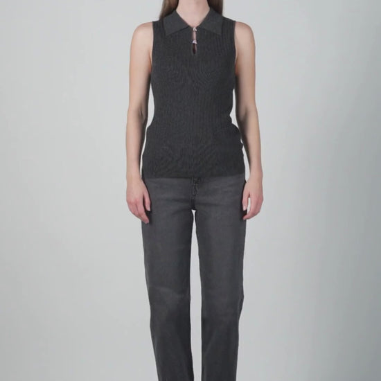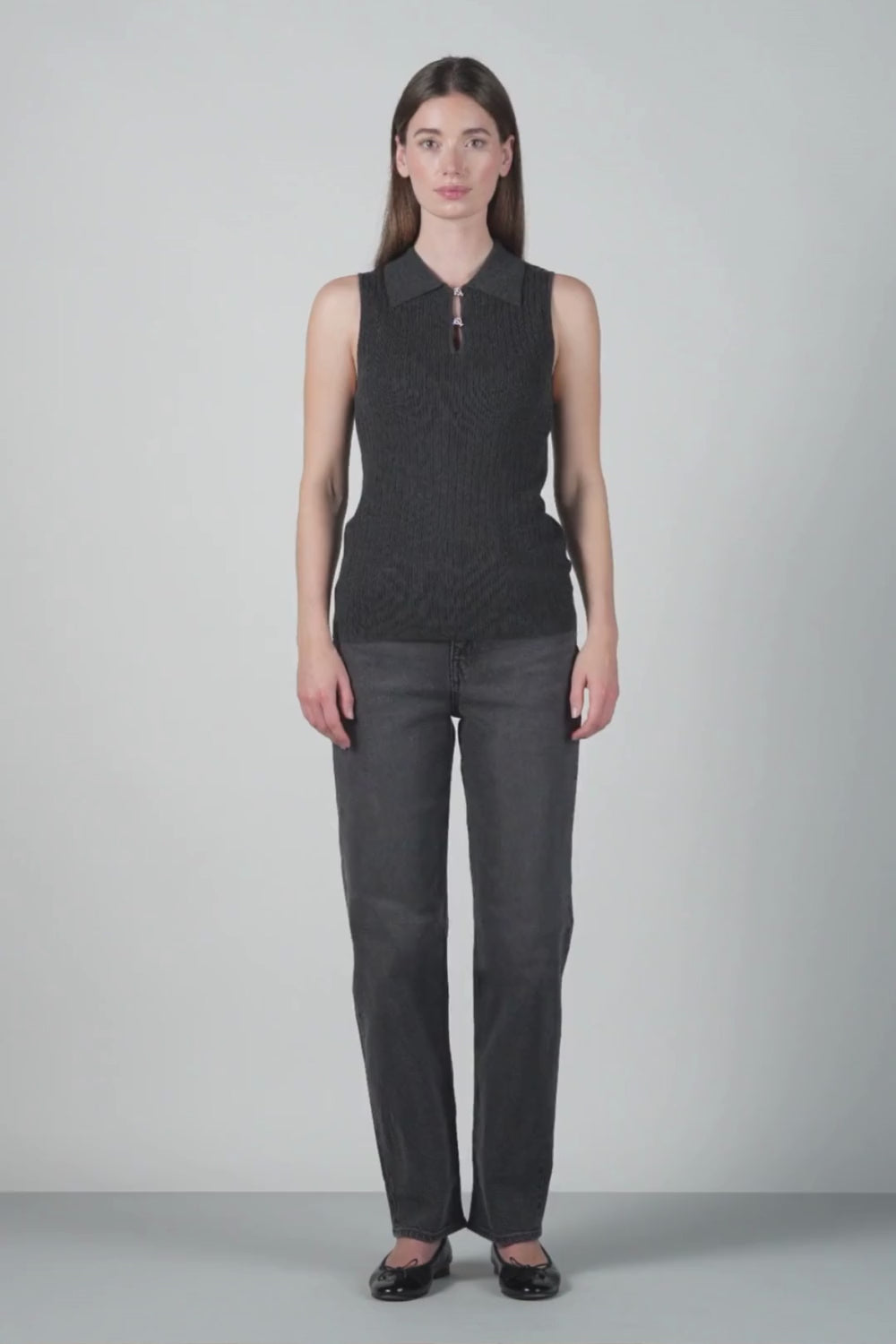 Maddie Top er en stilig, ermeløs topp med en raffinert kraft som tilfører et elegant preg. Den lukkes foran med vakre knapper formet som O'TAY-logoen, pyntet med strass. Maddie Top er laget i en eksklusiv blanding av 75 % merinoull og 25 % silke, og er både myk og behagelig å ha på. Perfekt som et elegant statement-piece.