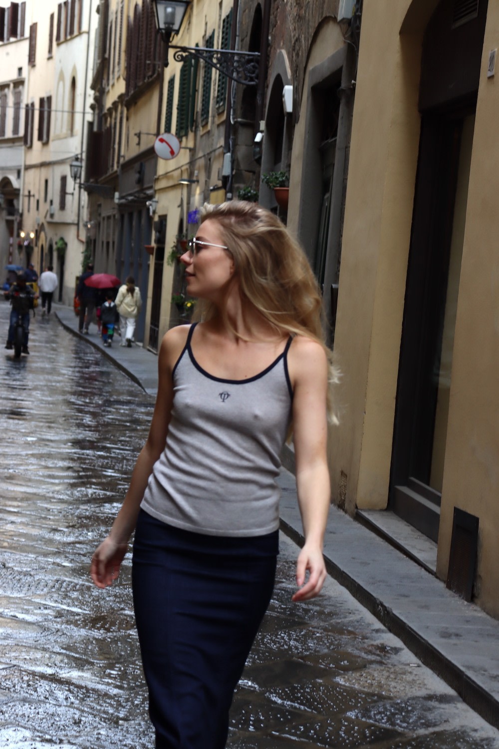 Enda en vakker og allsidig basistopp. Alle trenger en god topp i garderoben. Denne myke toppen har vårt velkjente logo plassert midt på brystet, som gir et moderne og stilrent uttrykk. Kombiner denne enkle, men klassiske stroppetoppen med våre Gianna-bukser eller Gerda-skjørt for den perfekte sommerlooken.