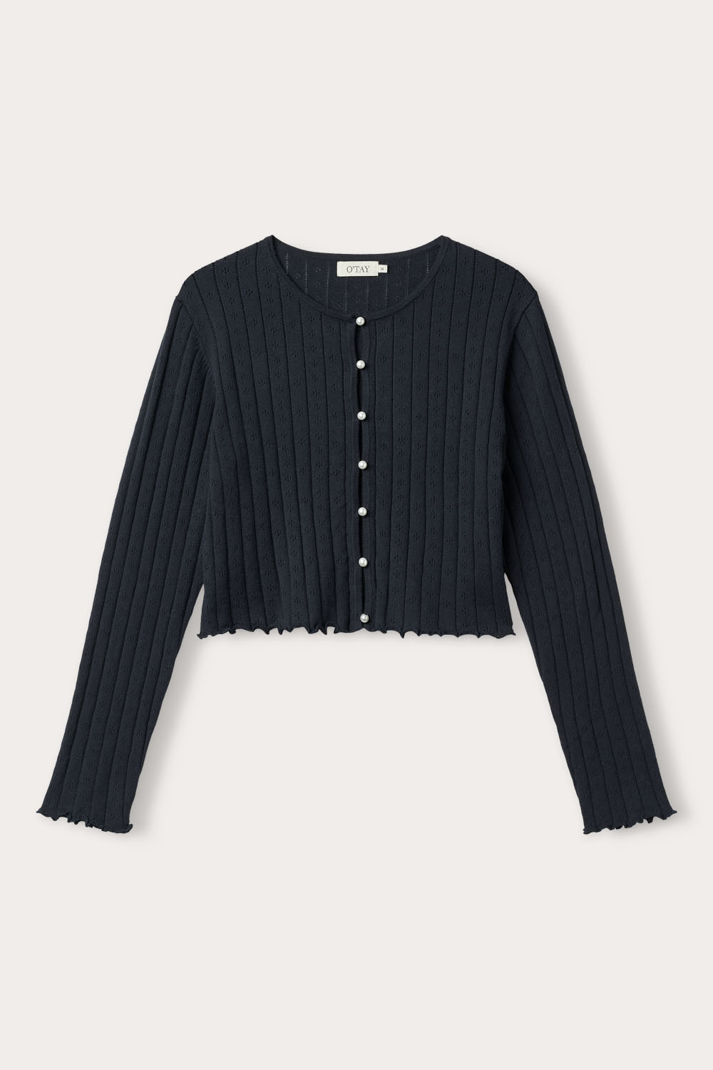 Gwen Cardigan er den skjønneste cardiganen i det populære pointelle-mønsteret. Cardiganen er lett cropped uten å være for kort. Den har våre vakre og velkjente perleknapper og bølgete kanter på både ermene og i livet. Kombinere med vår populære Carla Top og Frederikke Pants for det ultimate sommersettet i pointelle-mønster.