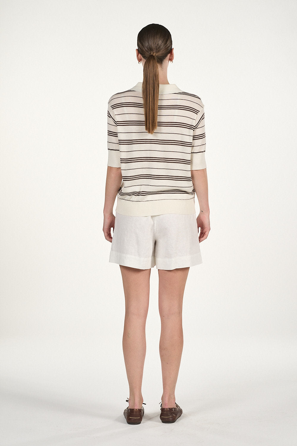 Vår Malli T-skjorte er et eksklusivt T-skjorte laget av 100 % ull. Stoffet er både lett og mykt, noe som gjør den behagelig mot huden. Den lyse bunnen med brune striper gir T-skjorten et sofistikert uttrykk. En delikat krage og tre knapper foran tilfører et elegant preg, mens O'TAY-logoen på venstre side gir et mer detaljert uttrykk. Ribbestrikkede kanter på ermene og nederst sørger for et vakkert passform og en raffinert finish på designet. Perfekt for et avslappet, men stilfullt uttrykk.