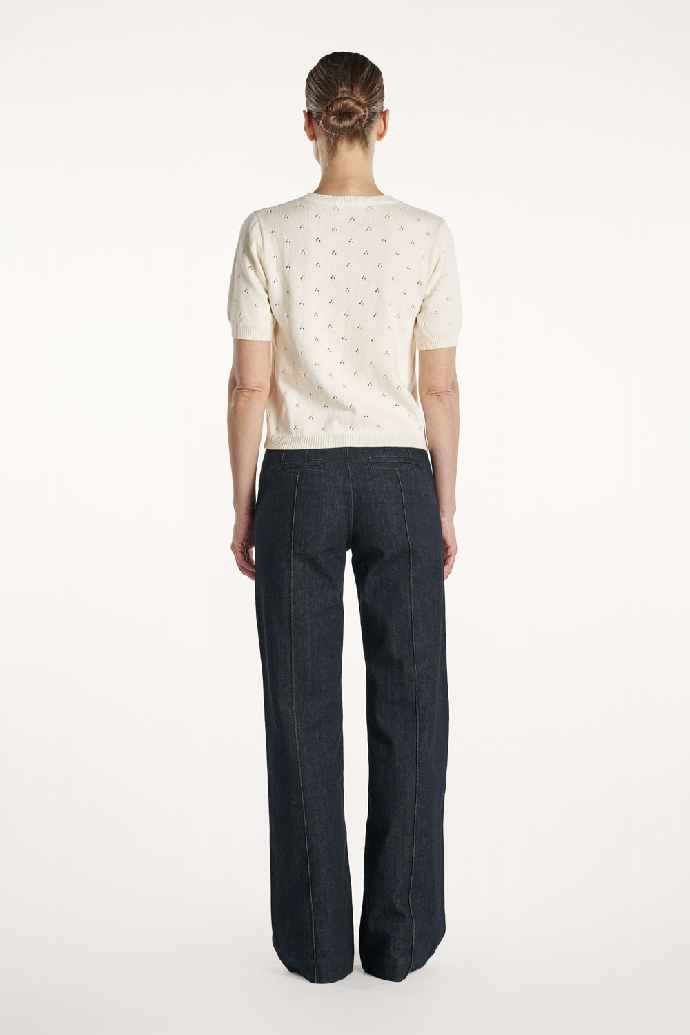 Vår Maxine T-skjorte har en delikat, rund halsutskjæring med subtile stoffdetaljer som gir et eksklusivt og sofistikert uttrykk. Laget av 100 % bomull, kjennes den myk og behagelig mot huden. Den elegante perleknappelukkingen foran gir en vakker og feminin finish, og lar deg justere uttrykket etter din egen stil.