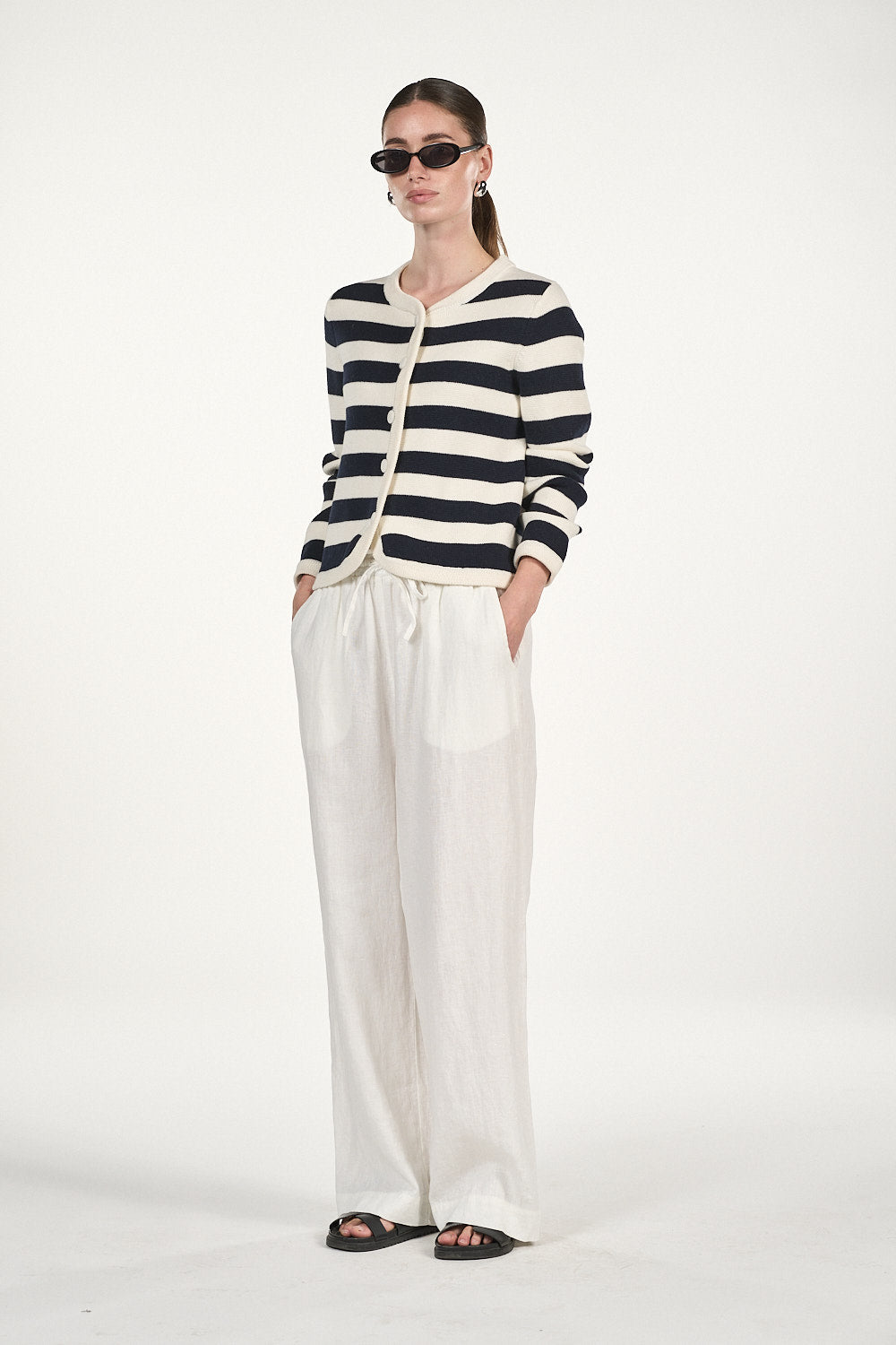 Mia Cardigan er laget i en myk blanding av 50 % ull og 50 % bomull, og gir den perfekte balansen mellom varme og pusteevne. Den har en offwhite farge med sorte striper og matchende knapper, som gir et tidløst og sofistikert uttrykk.