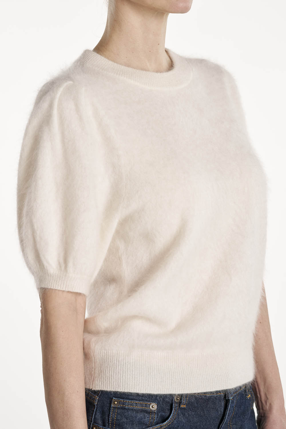 Pippi T-Shirt er laget i 100 % brushed cashmere og kombinerer myk luksus med et feminint preg. Den har små puff-ermer og en flatterende lengde som gir et elegant, eksklusivt utseende. En perfekt t-skjorte til både hverdagsbruk og mer formelle anledninger.